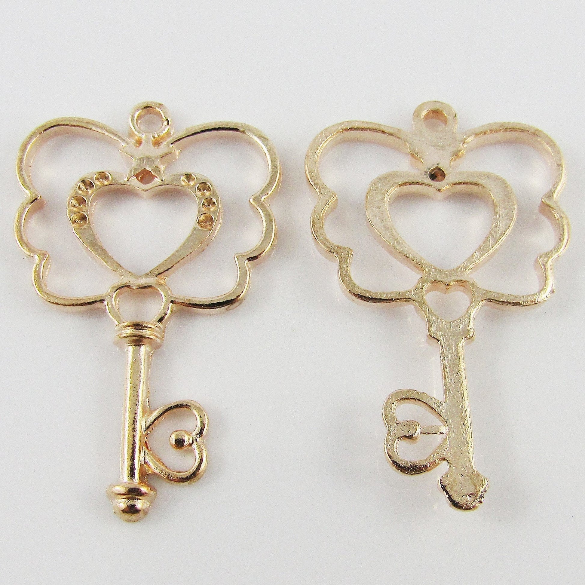 10pcs Butterfly Heart Key Charm Pendant Light Rose Gold 38x23mm Open Bezel