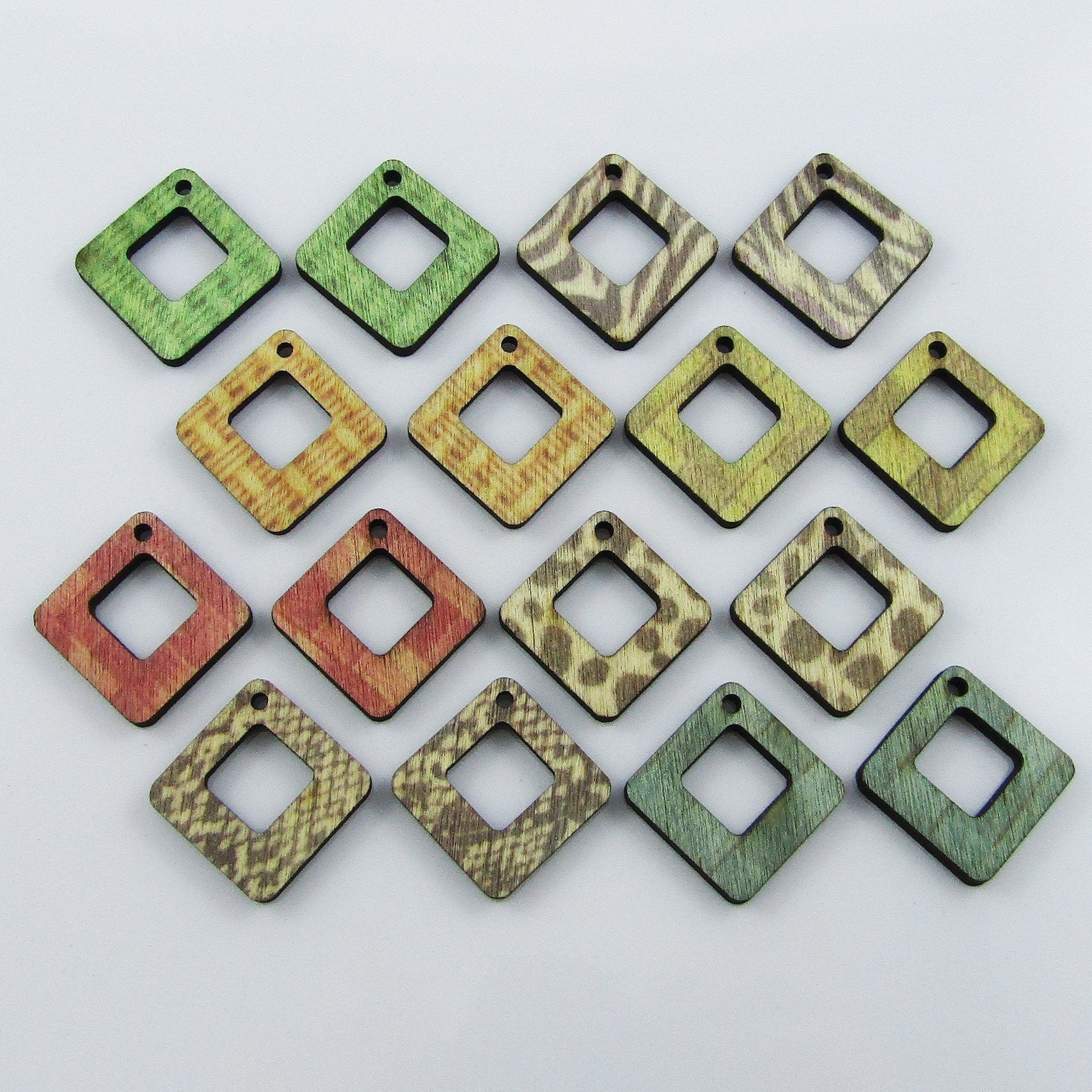 10pcs in Random Pairs Printed Wood Diamond Charm Pendant 24x24mm