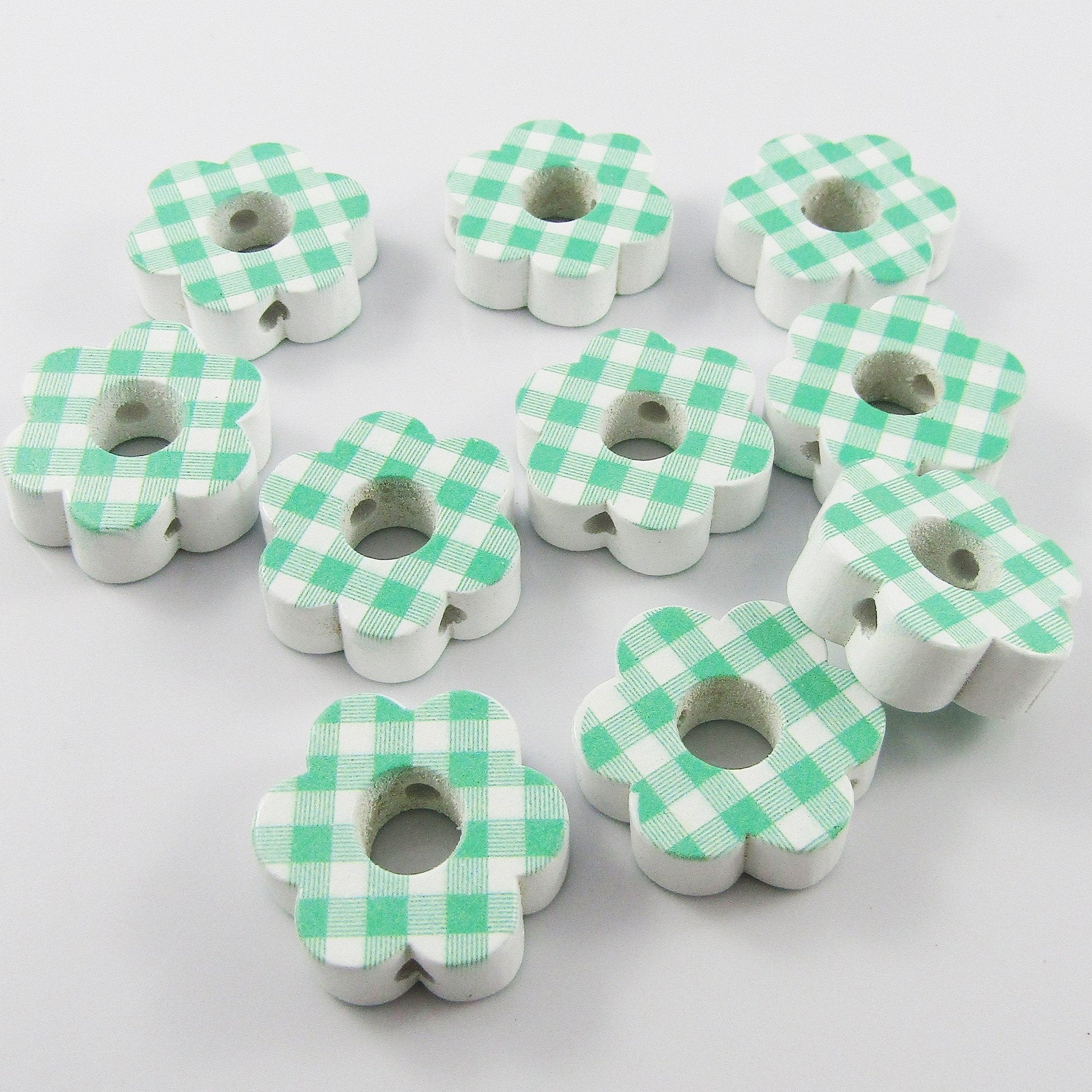 10pcs Printed Hemu Wood Green Gingham Flower Bead Craft 22x24mm Hole 3mm