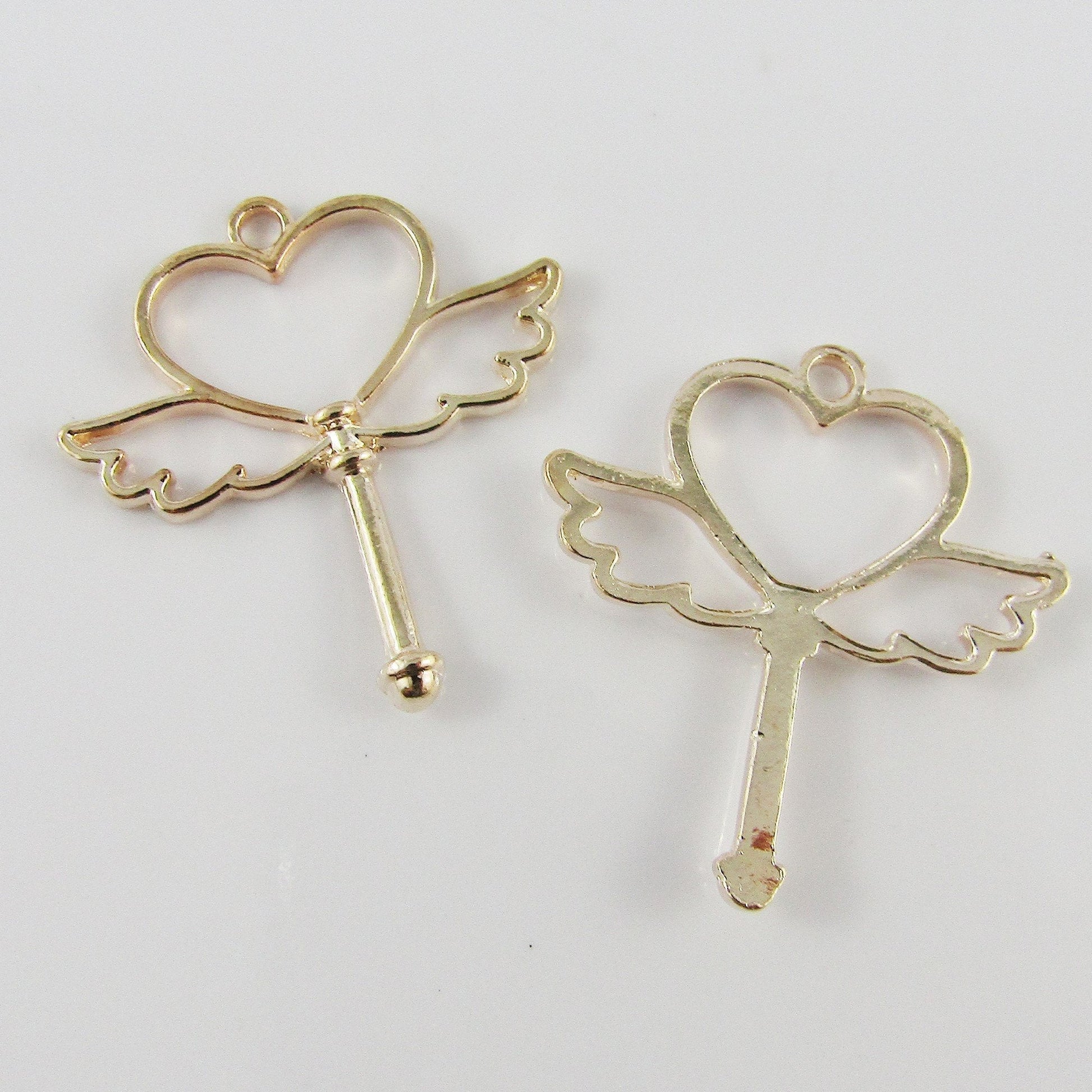10pcs Wing Heart Fairy Wand Charm Pendant Light Rose Gold 38x35mm Open Bezel