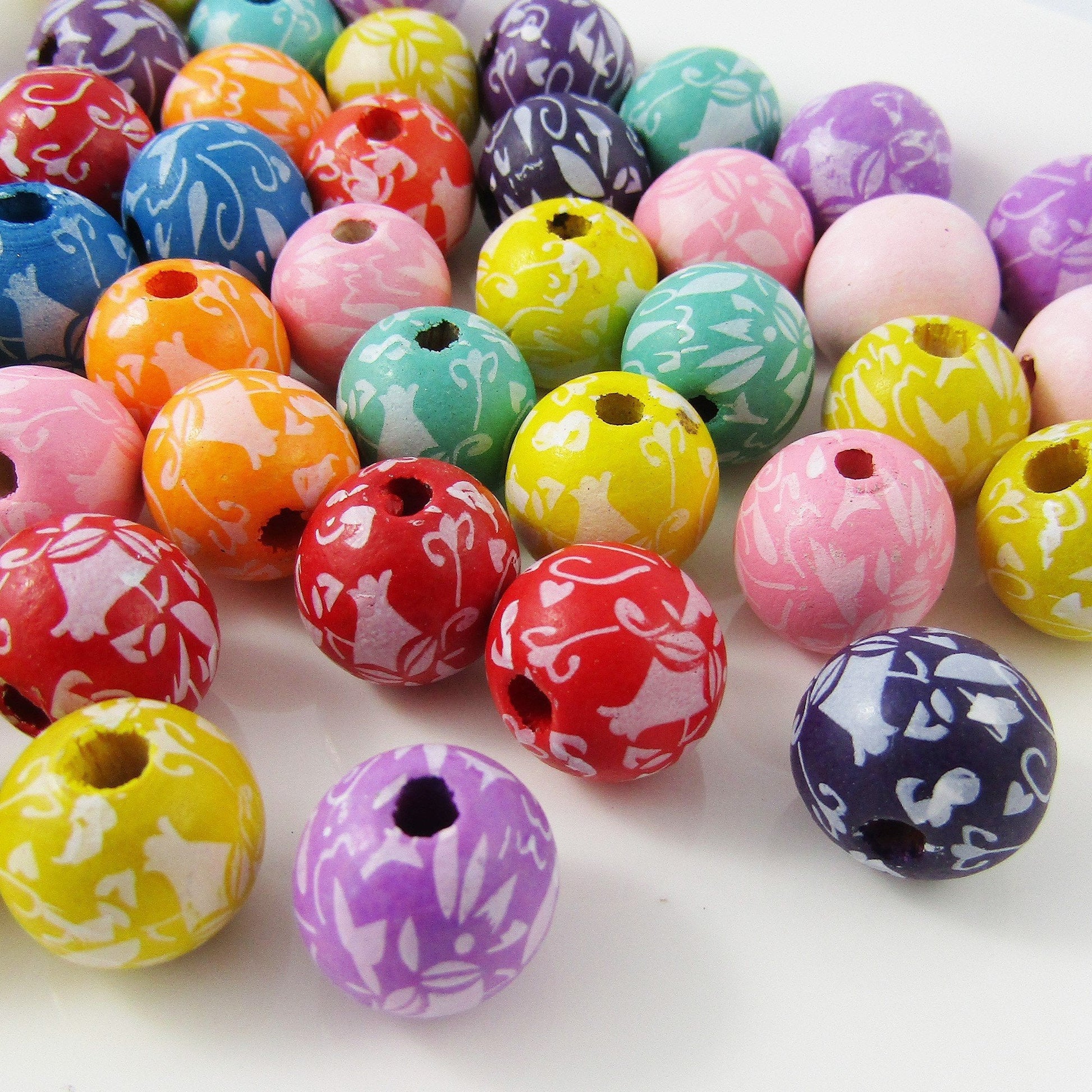 20pcs Round Floral Print Bead Wood Painted 14x13mm Hole 3mm
