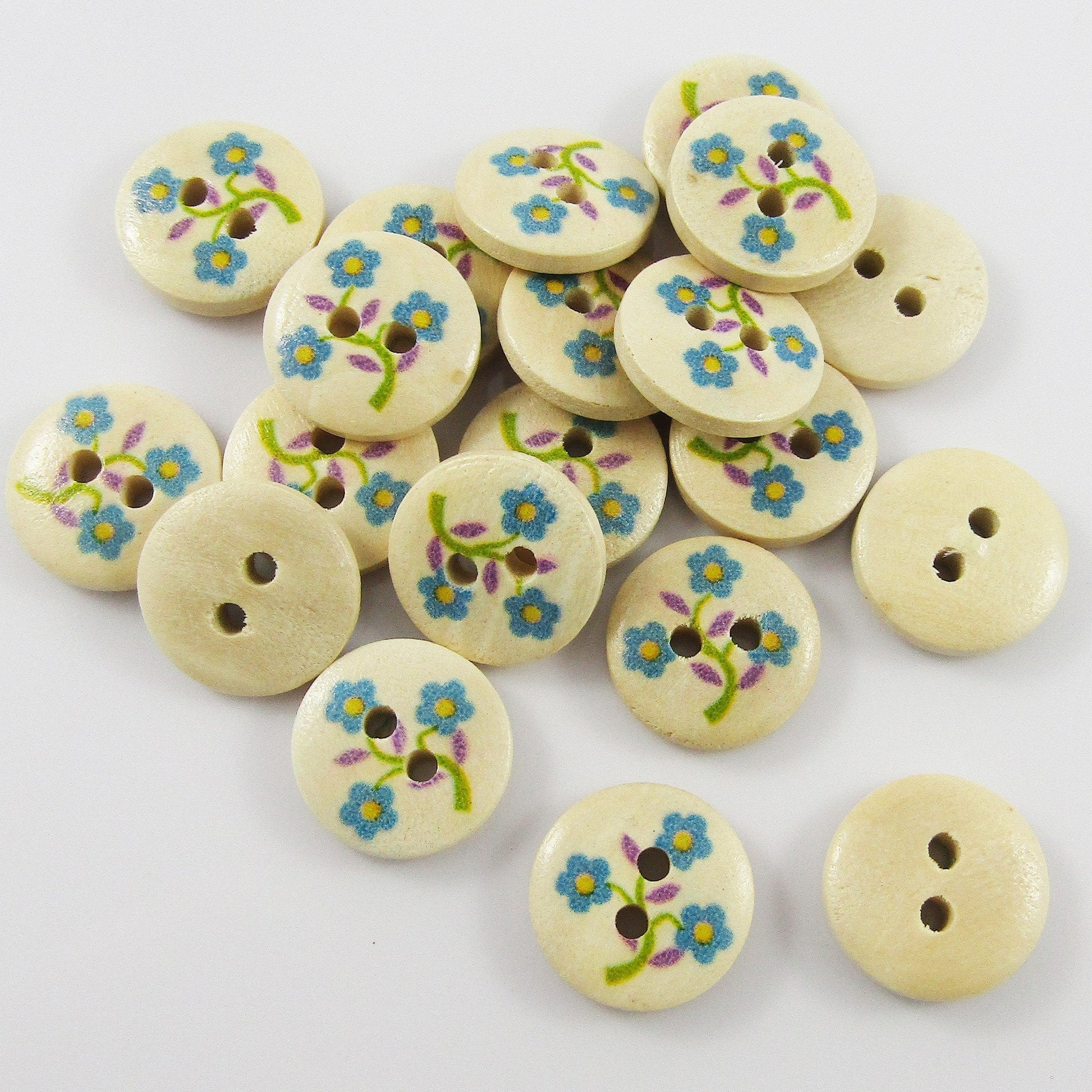 25pce Forget me Not Flower Printed Wood Button Round 2-hole 15mm Sewing