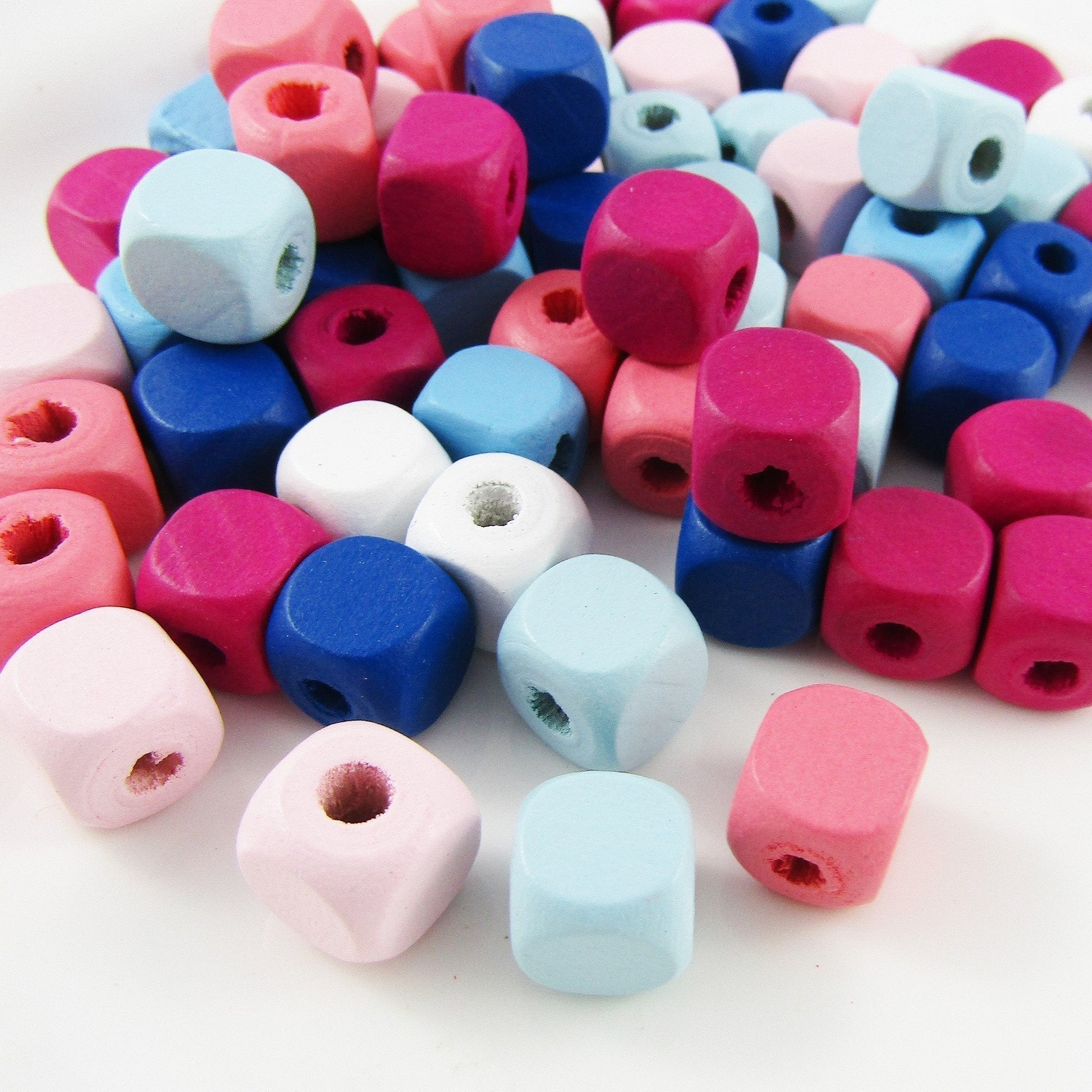 50g 100+pcs Wood Cube Craft Beads Mixed Pink Blue White 10x10mm Hole 3.5mm