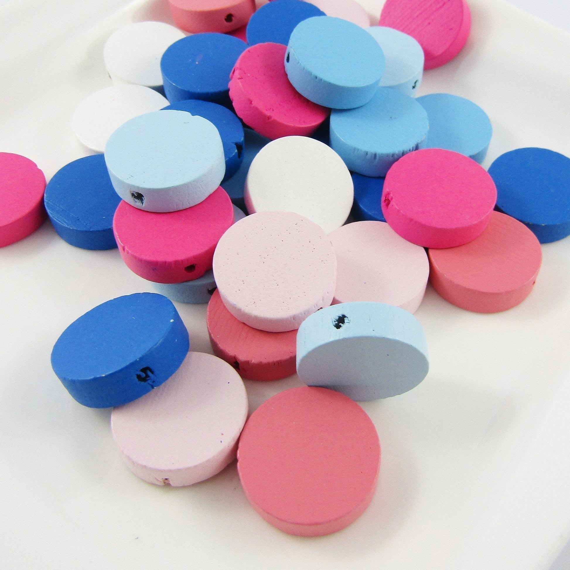 50g 40+pcs Wood Round Disc Craft Beads Mixed Pink Blue White 19x6.5mm Hole 2mm