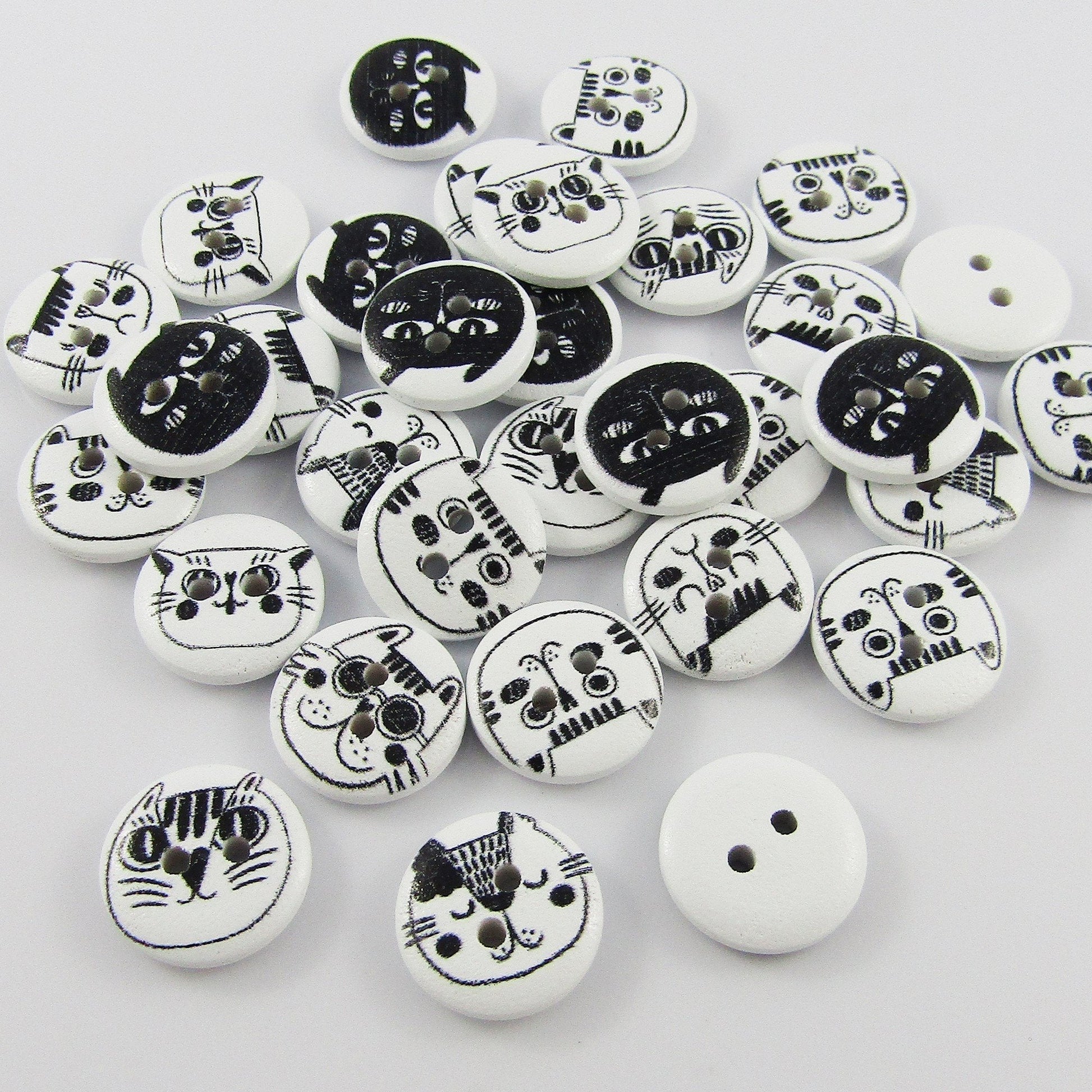 50pce Black & White Cats 2 Hole Wood Button Round 15mm Sewing Cards Junk Journal