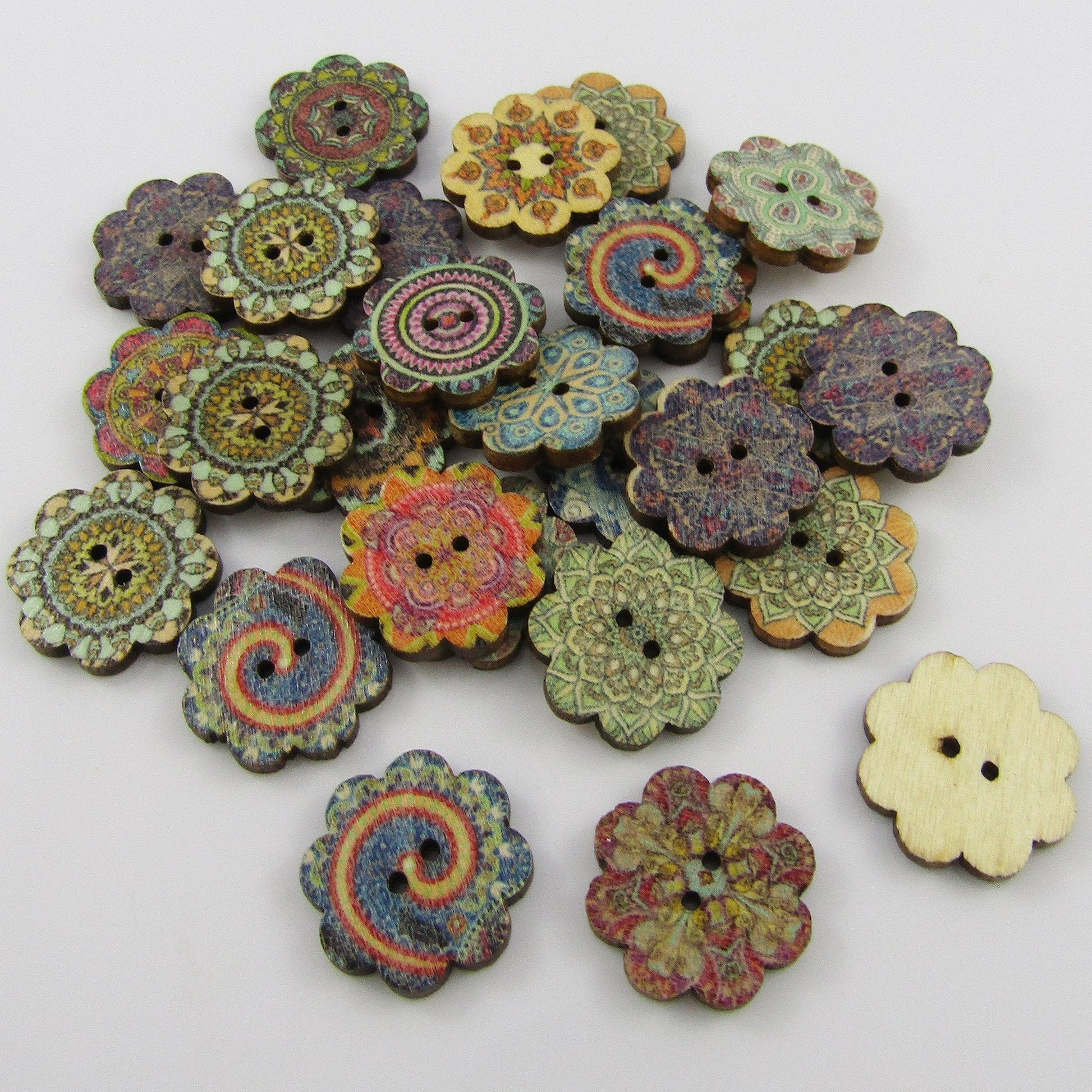 50pce Flower Printed 2 Hole Wood Button 20mm Sewing Cards Junk Journal etc