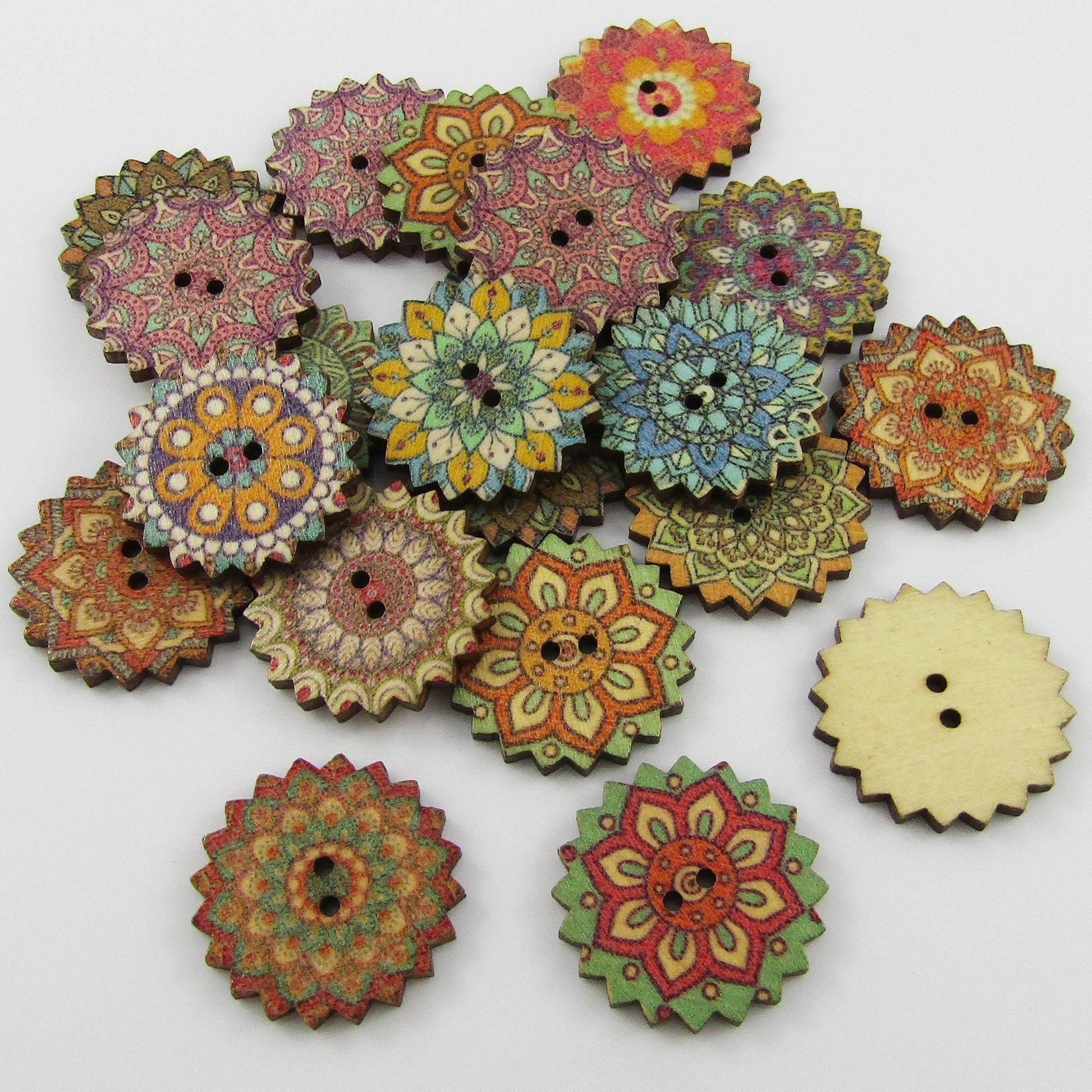 50pce Star Printed Mandala 2 Hole Wood Button 24mm Sewing Cards Junk Journal etc