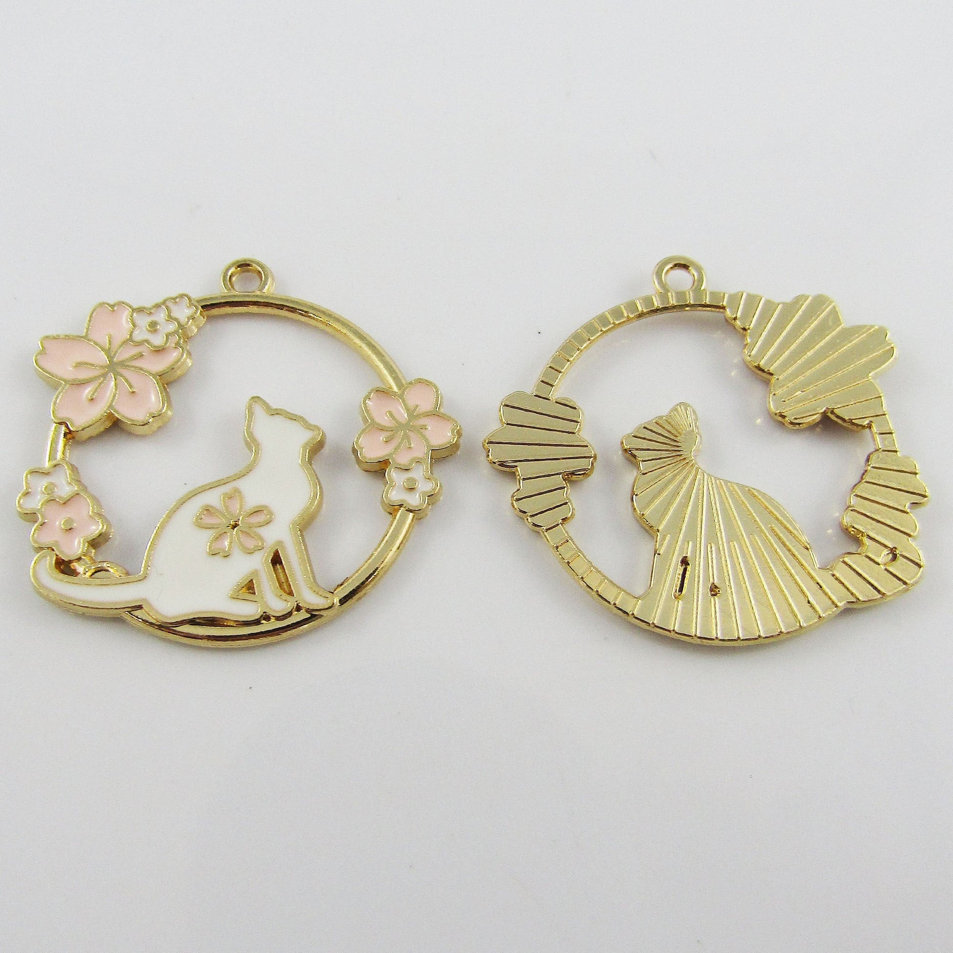 Bulk 10pce Enamel Cherry Blossom Cat Alloy Charm Pendant 31x30mm