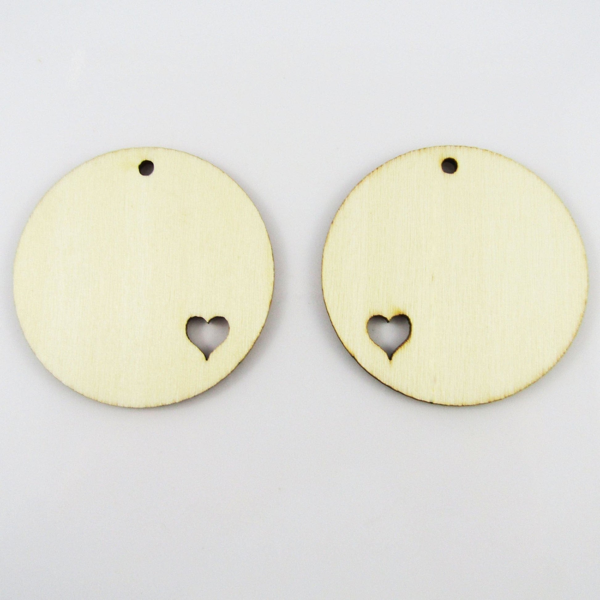 Bulk 10pcs Round w/ Cut Out Heart Unfinished Wood Charm Pendant Natural 49mm