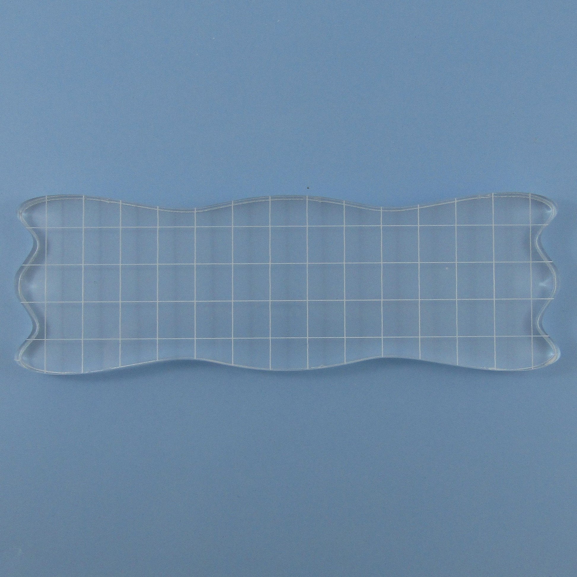 Acrylic Stamp Block for use with silicone stamps Waved edges for comfort grip and grid lines for easy stamp positioning! Qty: 1 piece Approximate Measurements: 150mm x 49mm x 7mm